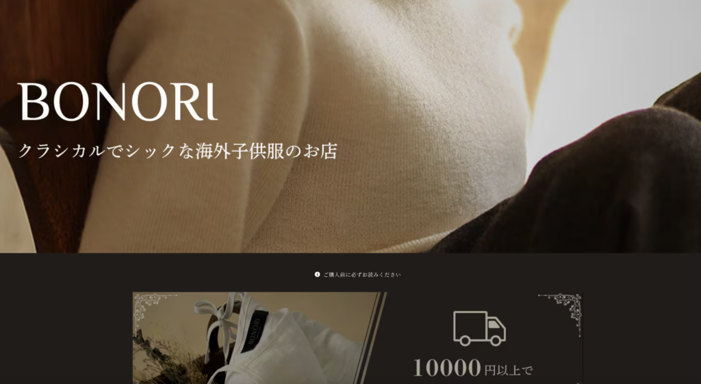 BONORI(ボノリ)は、海外から欧米諸国を思わせる上品でシルエットの美しいお洋服をセレクトし販売しています。あの有名ファッション雑誌の「FUDGE」を連想させるようなお洒落さで、子供服に思えないほどのデザインばかりです。クラシカルな雰囲気の洋服が多いので、その系統の親子コーデなどを考えている方におすすめのお店です◎
