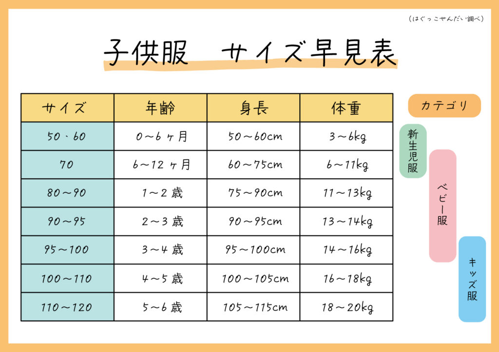 以下の「子供服サイズ早見表」を参考に、ぜひお子さんにぴったりのサイズを見つけてください!